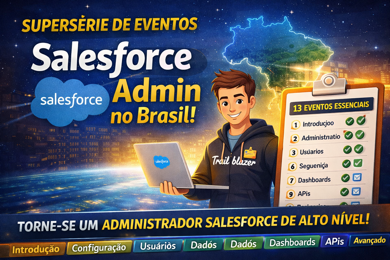 O universo de Salesforce no Brasil está evoluindo rapidamente e, além disso, novas oportunidades surgem para profissionais que desejam atuar como Administrador Salesforce. Pensando nisso, foi criada uma supersérie com 13 eventos estratégicos, focados em eliminar dúvidas, corrigir conceitos equivocados e, principalmente, fortalecer a base técnica dos participantes.