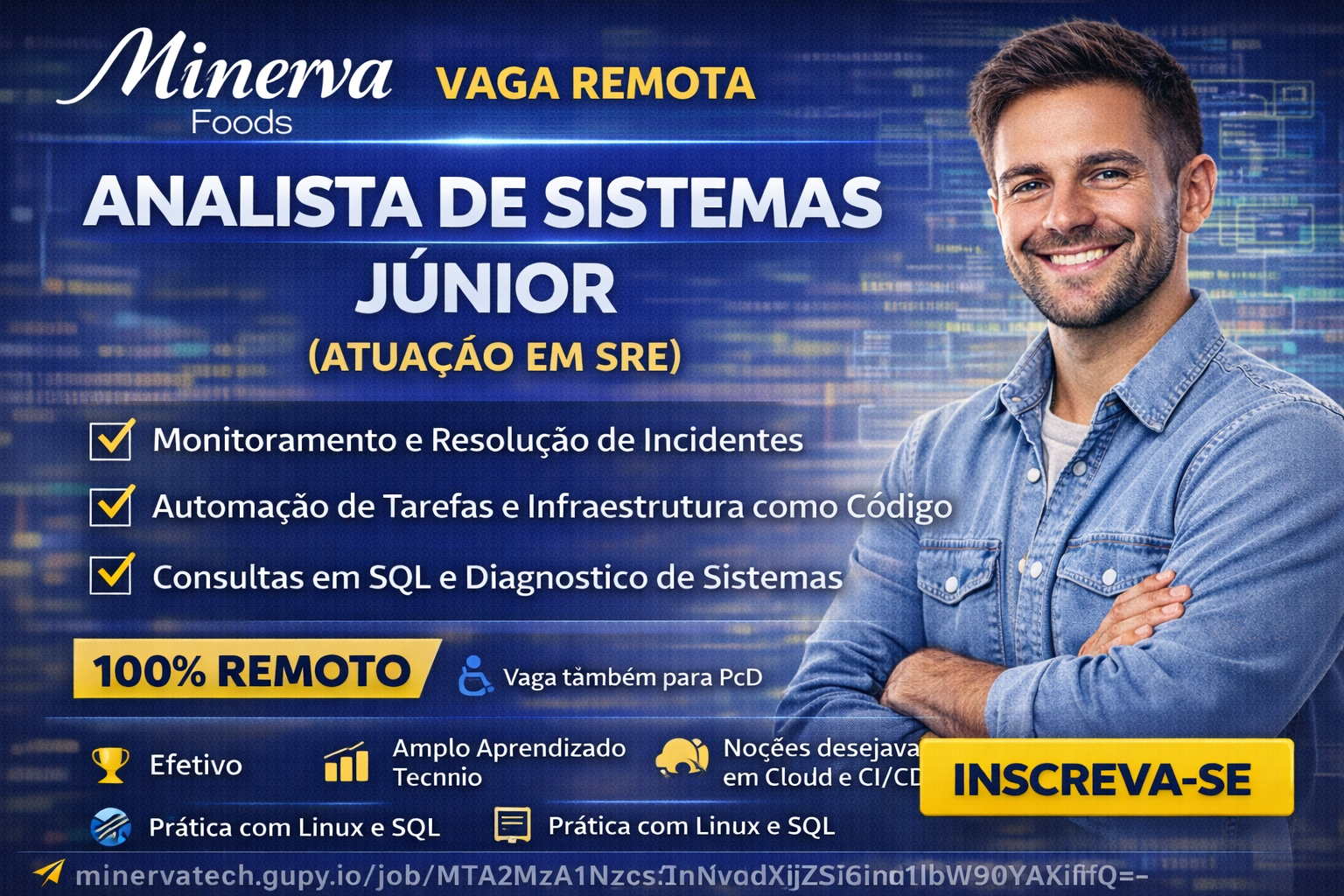 O avanço da transformação digital tem colocado a engenharia de confiabilidade no centro das operações das grandes empresas globais. Nesse contexto, a Minerva Foods abre uma oportunidade estratégica para quem está no início da carreira: a vaga de Analista de Sistemas Júnior (Atuação em SRE), com modelo 100% remoto, contratação efetiva e participação direta na sustentação de sistemas críticos que suportam uma cadeia produtiva presente em mais de cem países.