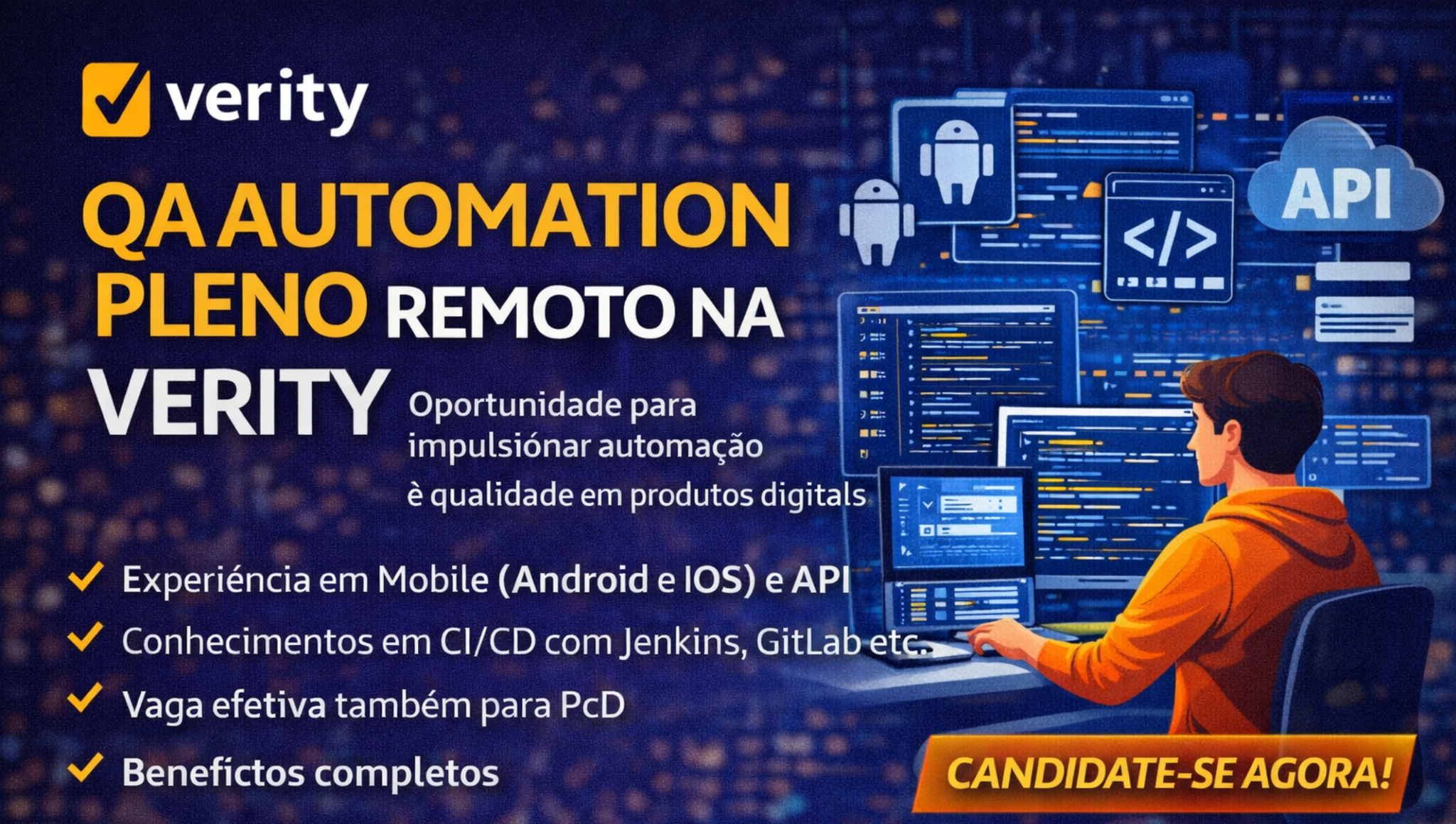 A Verity, reconhecida como uma das melhores empresas para se trabalhar pelo Great Place To Work, está com inscrições abertas para a vaga de QA Automation Pleno – Remoto. Além disso, a oportunidade é efetiva, elegível para PcD e direcionada a profissionais que desejam acelerar sua carreira em automação de testes, integração contínua e qualidade de software.