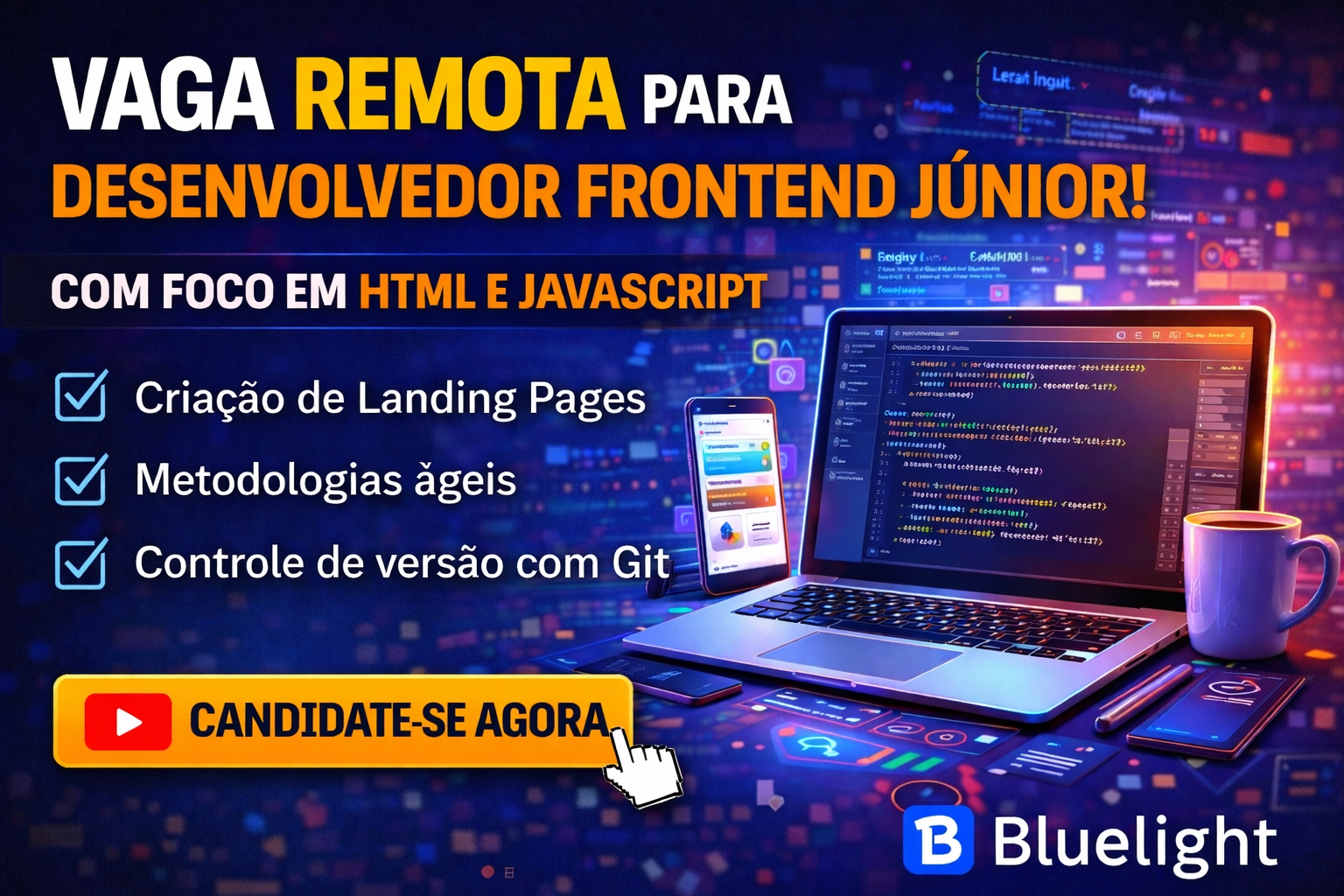 Nesse cenário, surgiu uma oportunidade para Desenvolvedor Frontend Júnior Remoto (América Latina) na empresa Bluelight, com atuação totalmente remota.