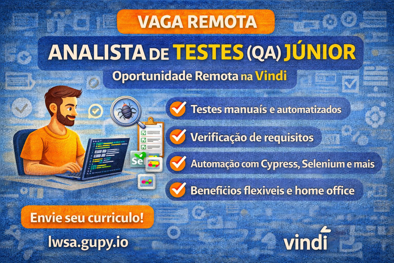 Nesse contexto, a Vindi, empresa que integra o ecossistema LWSA, abriu uma oportunidade para Analista de Testes (QA) Júnior em modelo totalmente remoto. Além disso, a posição permite que o profissional atue diretamente no ciclo de desenvolvimento de software, garantindo que funcionalidades e integrações operem com alto nível de confiabilidade.